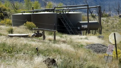 The big pink pipes in this photo are the penstocks of the Shoshone Hydroelectric Plant:
