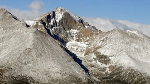 What looks like a snow-covered road running across the mountains is actually the Grand Ditch, a canal built in the eighteen-hundreds to carry water to the eastern plains from the far side of the Continental Divide. It's still in use today:
