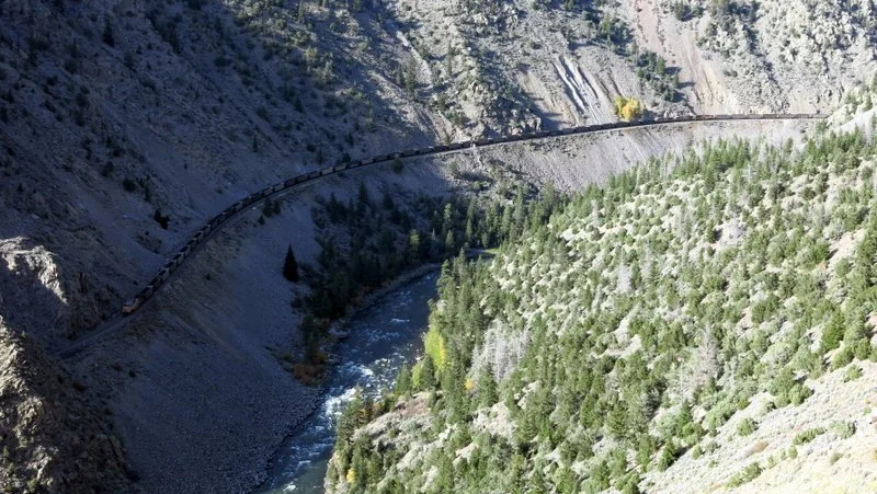 This is Gore Canyon and the Colorado River, viewed from a road that turned out not to be much of a road. That train is carrying coal: